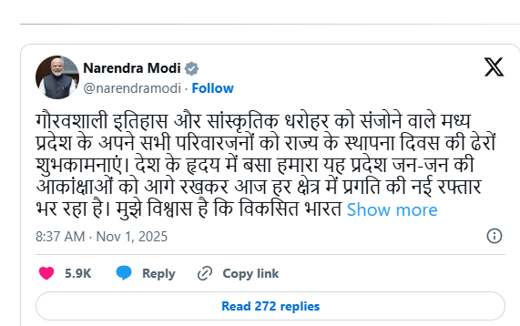 मध्यप्रदेश स्थापना दिवस: पीएम मोदी ने दी हार्दिक बधाई, उम्मीदों से भरा संदेश साझा किया