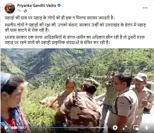 प्रियंका ने फेसबुक पर वीडियो साझा करते हुए लिखा स्थानीय लोगों ने पहाड़ों की रक्षा की, उनको संवारा, आज सरकार उन्हीं को घास काटने से रोक रही है। भाजपा सरकार जहां एक तरफ आदिवासियों से जंगल-जमीन का अधिकार छीनती जा रही है तो वहीं दूसरी पहाडियों को प्रकृतिक संपदाओं से वंचित कर रही है। रिपोर्ट्स की माने तो प्रियंका गांधी के इस मुद्दे को उठाने के बाद अब उत्तराखंड कांग्रेस भी इस मामले को और जोर शोर से उठाएगी।